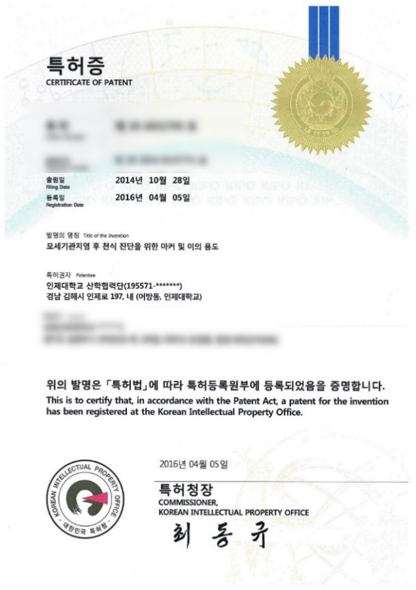 연구특허 국내특허 RSV 바이러스 모세기관지염 후 천식 발병군 예측 천식치료제 몬테루카스트 치료 반응군 예측 EDN을 이용한 천명 판별 방법 해외특허 일본특허 모세기관지염 후 천식 발병군 예측 일본특허 천식 또는 알레르기 질환 신속 진단용 키트 미국특허 천식 또는 알레르기 질환 신속 진단용 키트 상표등록 세포주 상표등록증 Weezekit ⓡ K-EDN Elisa Kit