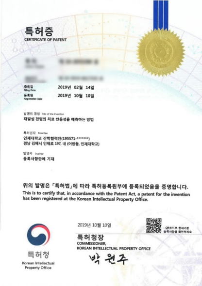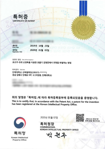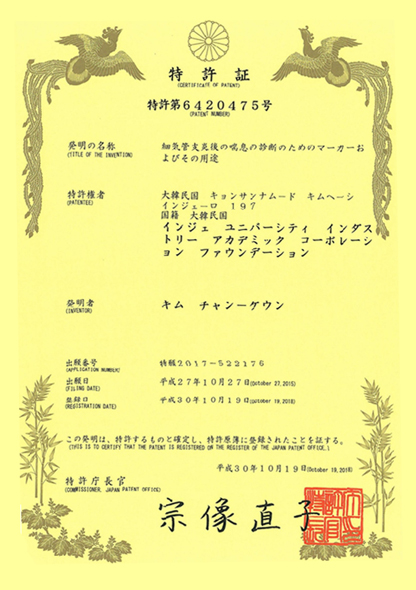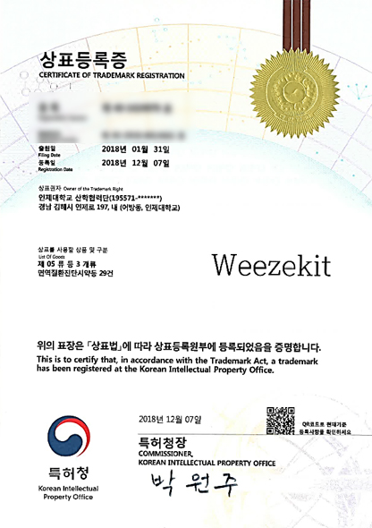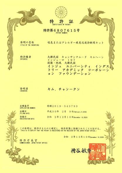 연구특허 국내특허 RSV 바이러스 모세기관지염 후 천식 발병군 예측 천식치료제 몬테루카스트 치료 반응군 예측 EDN을 이용한 천명 판별 방법 해외특허 일본특허 모세기관지염 후 천식 발병군 예측 일본특허 천식 또는 알레르기 질환 신속 진단용 키트 미국특허 천식 또는 알레르기 질환 신속 진단용 키트 상표등록 세포주 상표등록증 Weezekit ⓡ K-EDN Elisa Kit